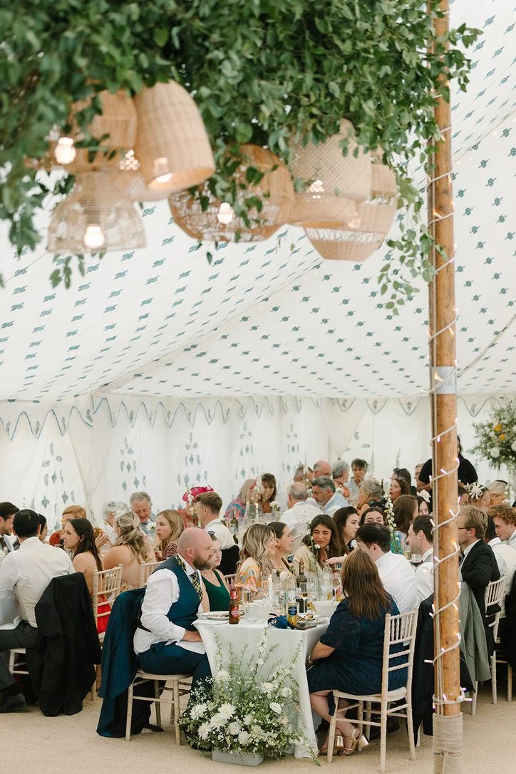 The stunning sail cloth marquee by The Pearl Tent Company was lined with their “Cornish Blue” linings providing a Moorish aesthetic as the backdrop for our overhead foliage and rattan lantern installations.