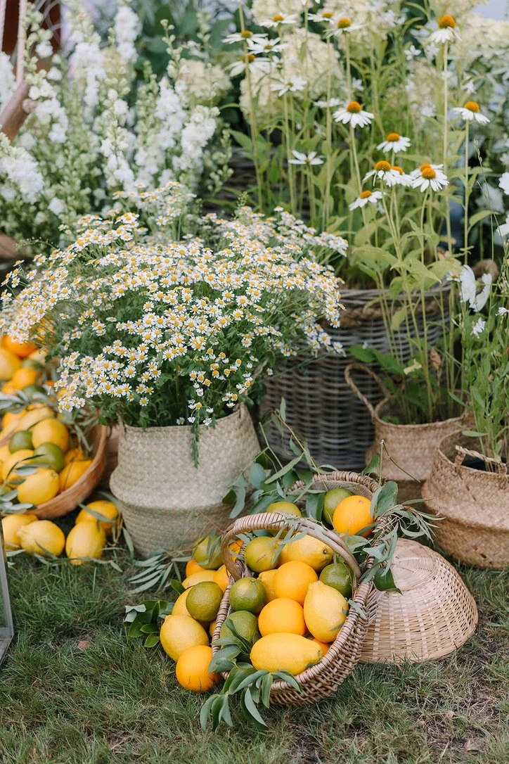 Ensuring cohesive styling from church to marquee, the entrance of the marquee was styled with huge olive trees, wicker baskets layered with potted plants, herbs and cut flowers and, of course more citrus.
