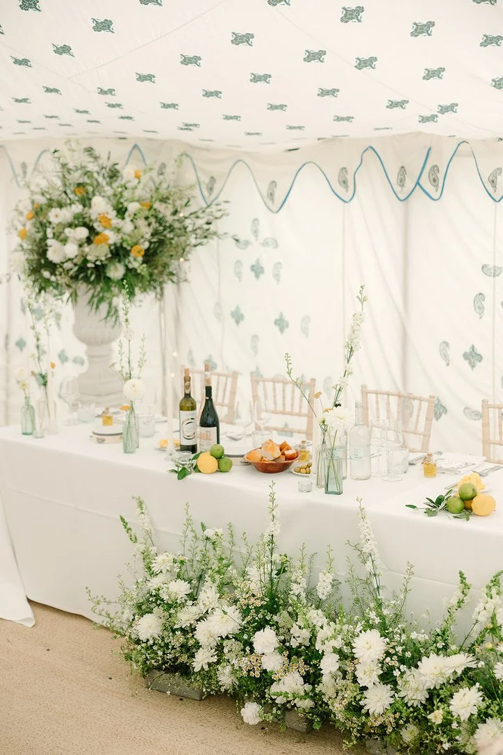 The result was a luxury marquee wedding filled with refined, elegant florals that seamlessly blended English countryside charm with Mediterranean soul.
