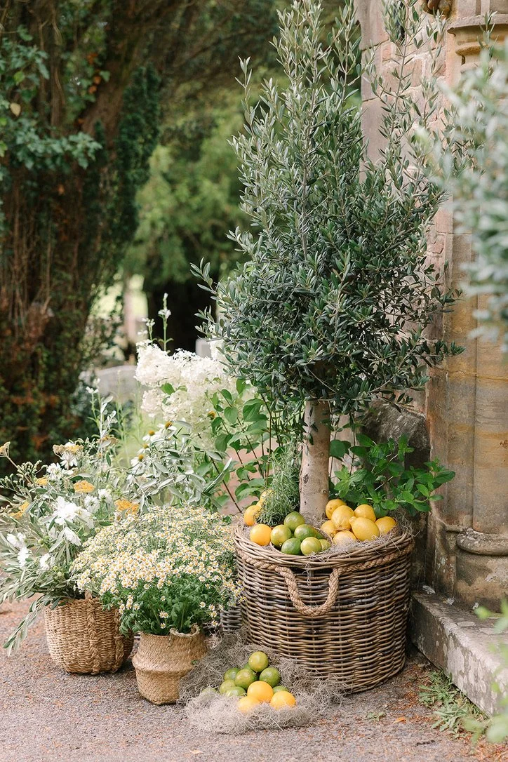 Olive trees, wicker baskets filled with seasonal flowers, and fresh citrus created a warm Mediterranean welcome at the village church entrance.
