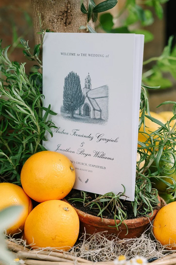 Andrea and Jonny’s wedding styling was a fusion of English country garden charm and the warmth and vibrancy of Spanish culture, brought to life through abundant, garden inspired wedding flowers that complemented the village church and marquee garden setting, whilst evoking the romance of the Mediterranean and honouring Andrea’s Spanish heritage.